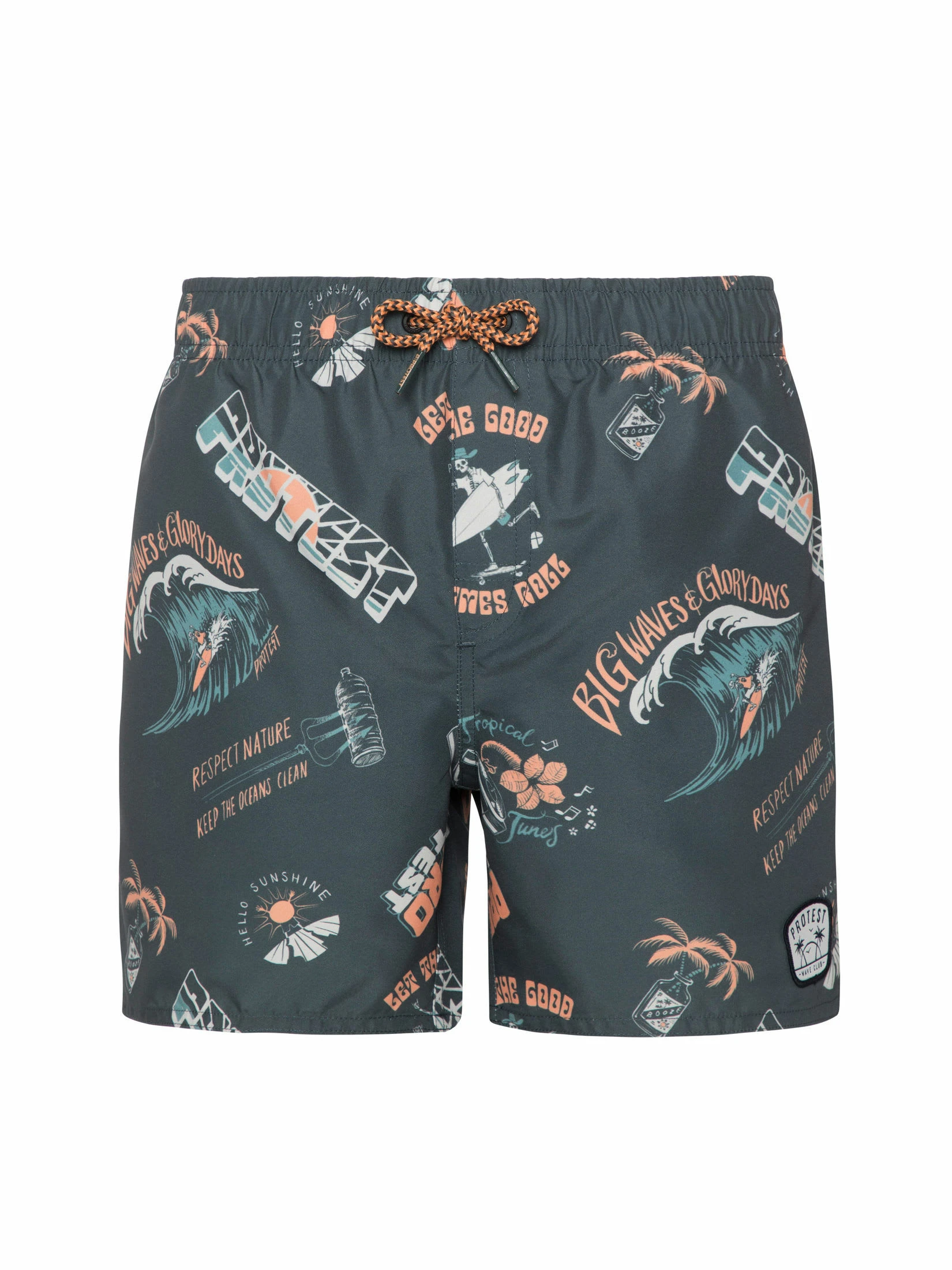 Hier ist die tolle PRTHARRIS JR von Protest. Diese großartige Badeshorts ist mit einem tollen Allover-Minimuster aus Text, Wellen und sommerlichen Motiven bedruckt. Der elastische Bund hat ein Zickzack-Zugband. Die Badeshorts hat eine kurze Länge und reicht bis zur Mitte des Oberschenkels. Sie hat eine normale Passform, eine Gesäßtasche und einen Innenslip, der zusätzlichen Schutz bietet. Mit der PRTHARRIS JR von Protest hast du Spaß in der Sonne.